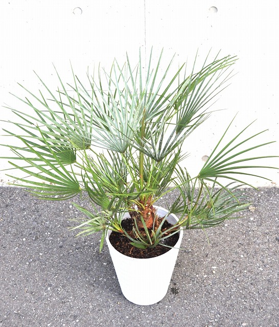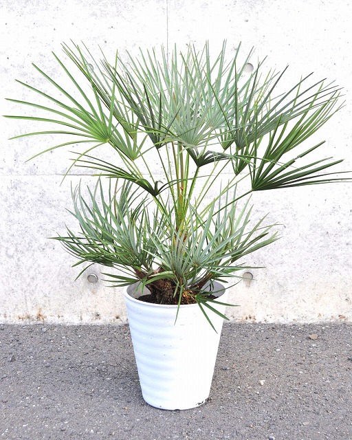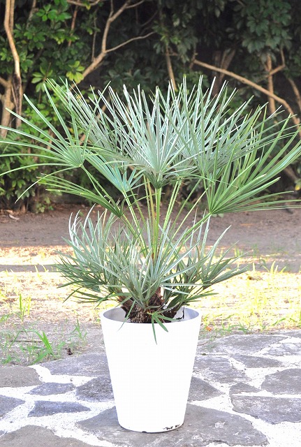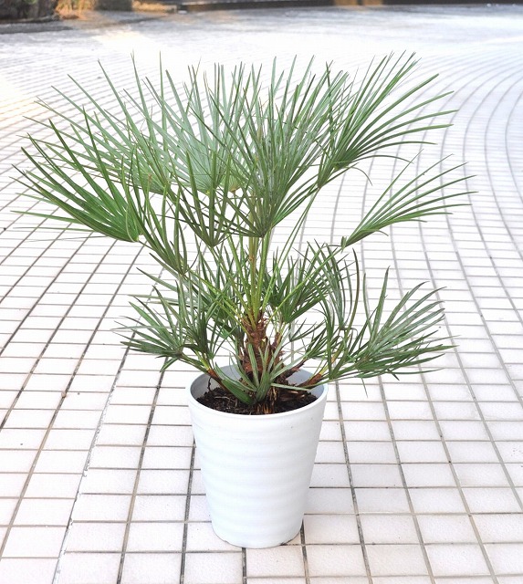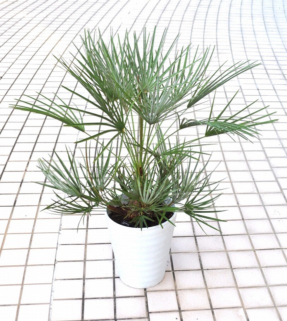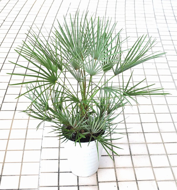 地中海沿岸が原産地のシャープな掌状の葉をもつかっこいいヤシ。子株が発生し叢生します。耐寒性があり外置きや露地植えにもおすすめです。