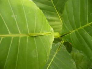 下の画像はディレニア・スフルティコサの新しい葉を展開する様子です。葉の付け根、葉柄部分に次に展開する新しい葉が収納?されています。