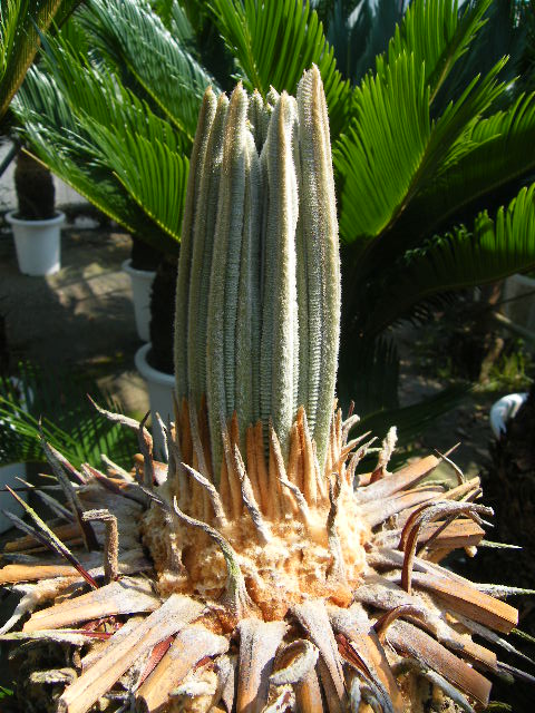 通常、特に大きなソテツはずっと鉢で生産されるわけではありません。露地から掘り上げ、葉と、根もほとんどない状態で鉢に植えられます。その後、 下のように葉が展開します。