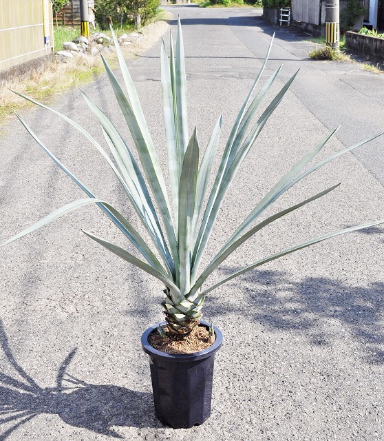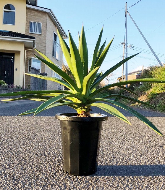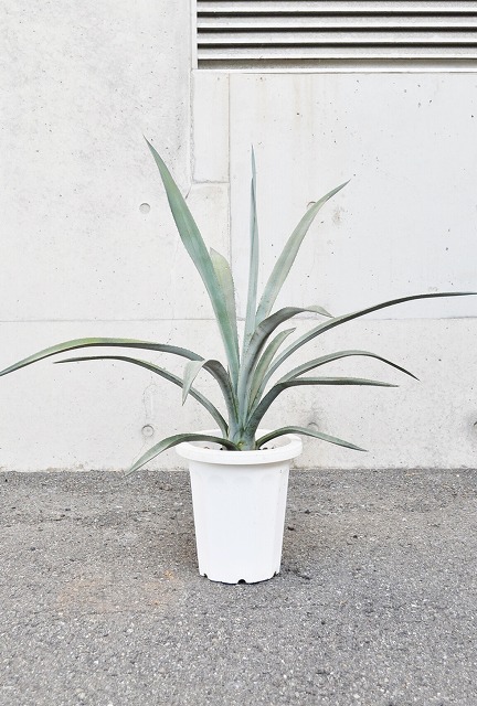 アガベ・サイザラーナ(Agave sisalana)、8号サイズです。サイザル麻の原料となるアガベです。葉から繊維をとります。ダーツの的もこのアガベの繊維からつくられているそうです。葉の両サイドには基本的にはトゲがありません(個体差でトゲがある場合があります。)。シルバーブルーの葉が直線的に伸び、広がります。剣が綺麗に放射状に広がっているような姿で、見た目的にもかっこよく、観葉植物として鑑賞性が高いと思います。他の画像1、他の画像2。
