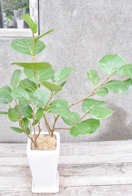 自然なカーブを描く幹、枝から丸いかわいい葉が連続するおしゃれな観葉植物。