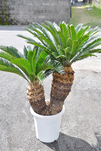 実物画像です。鉢サイズ:13号です。冬場、現在も屋外で管理のソテツです。二股に分かれるということではなく株元で融合したように株立ったものと思います。幹丈はそれぞれ、約60cm、約40cmです。ソテツ125他の画像1、ソテツ125他の画像2、ソテツ125他の画像3。